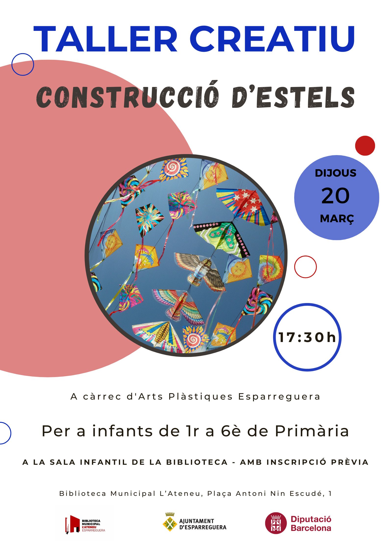 Amb el Dia Meteorològic Mundial a tocar, el dijous 20 de març, a les 17.30 h, la Biblioteca us proposa participar al Taller creatiu de construcció d'estels. Coneixerem els fonaments de l'aerodinàmica, dissenyant i confeccionant un colorit estel. L'activitat és per a infants de 1r a 6è de Primària i anirà a càrrec d'Arts Plàstiques Esparreguera.