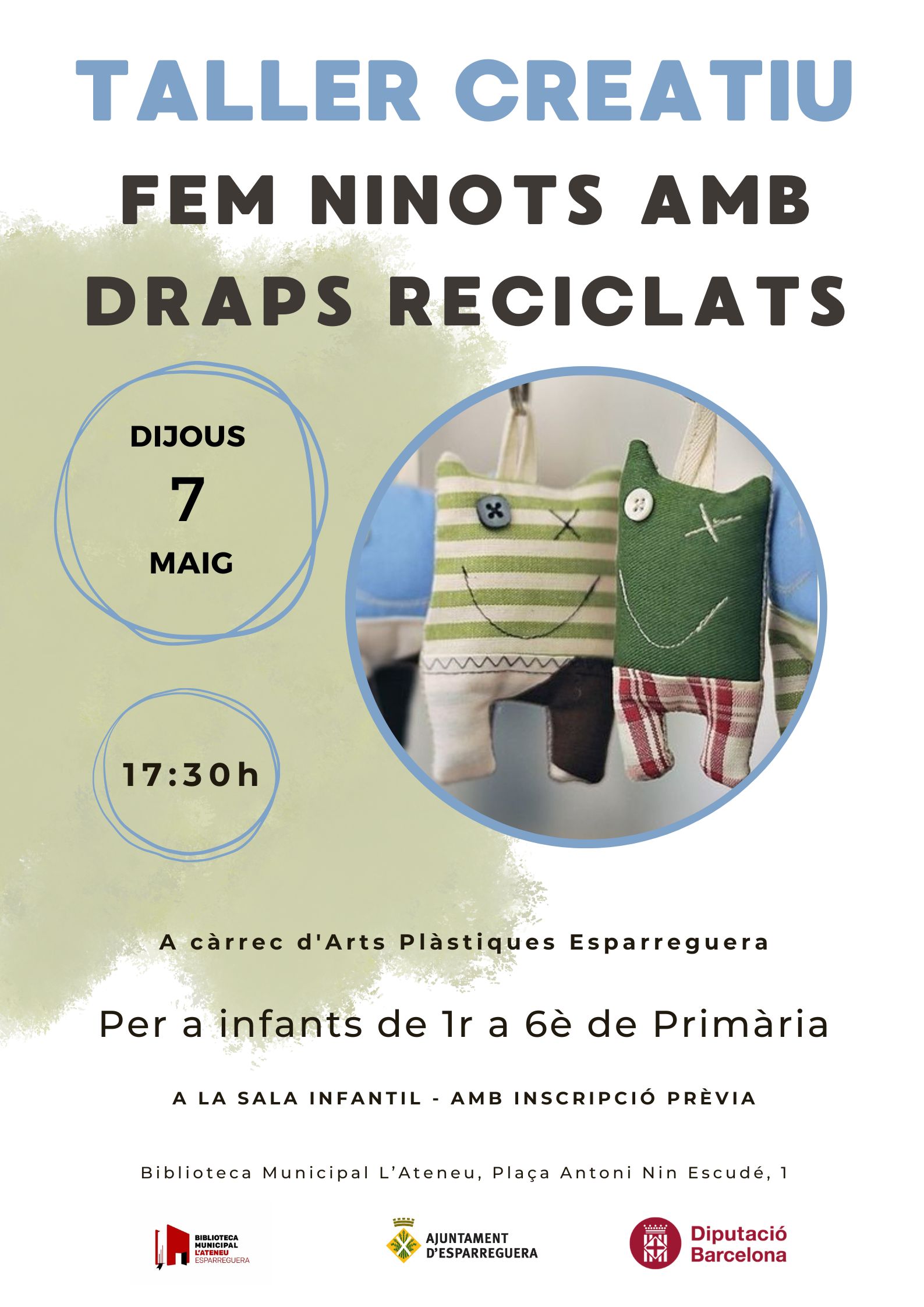 Al maig se celebra el Dia del Comerç Just i des de la Biblioteca ens hi sumem el dijous 7, a les 17.30 h amb el taller creatiu "Fem un ninot de draps reciclats". Reaprofitarem retalls de roba cosint ninots únics i personalitzats, mentre parlem del cicle de la roba i del reciclatge. L'activitat anirà a càrrec d'Arts Plàstiques Esparreguera i està pensada per a infants de 1r a 6è de Primària.