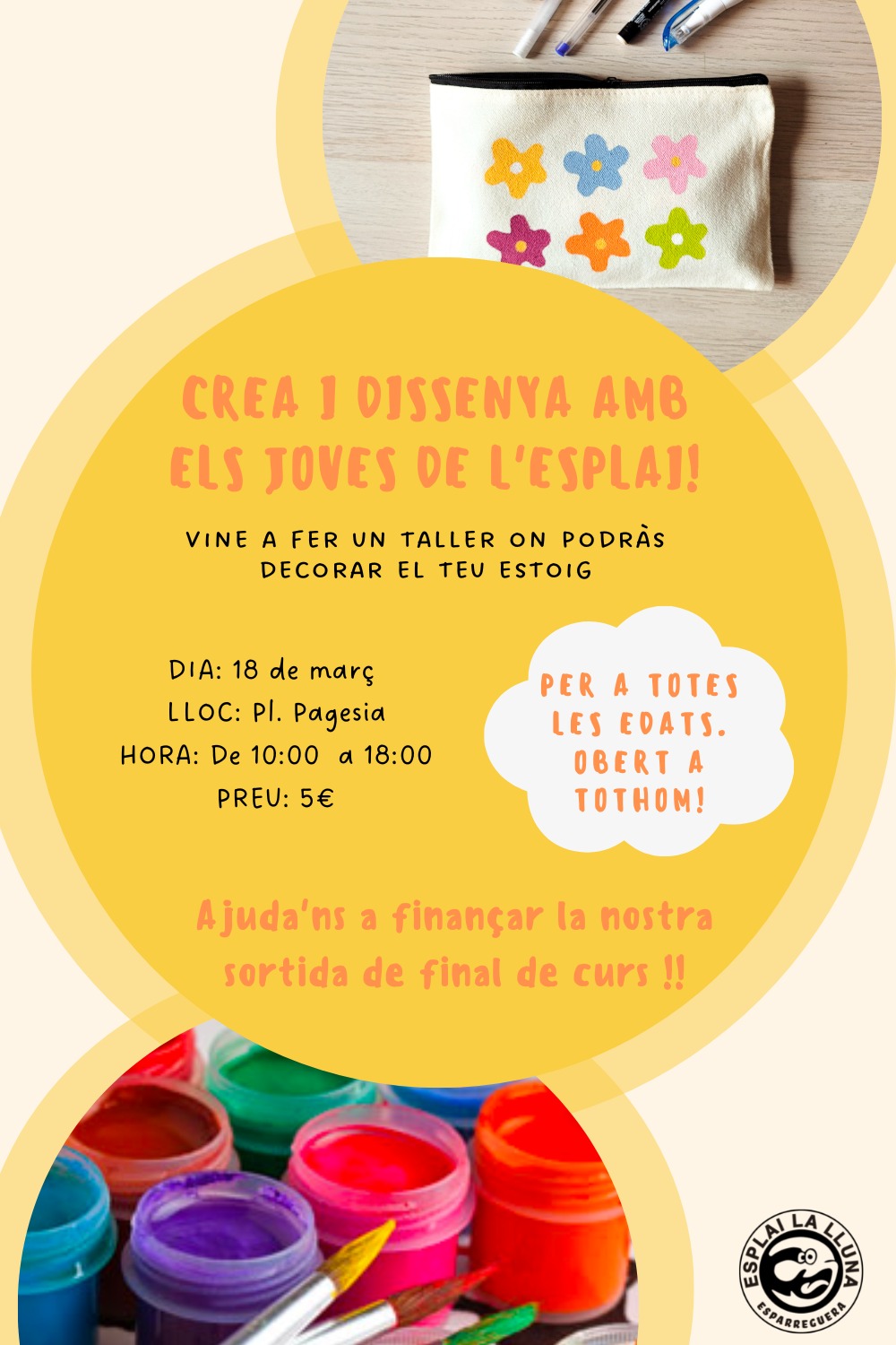 El grup de joves de l'Esplai La Lluna organitza un taller per a decorar estoigs de tela per a finançar la seva sortida de final de curs. L'activitat és apta per a totes les edats i es podrà fer de 10 h a 18 h a la plaça de la Pagesia per un preu de 5 euros.