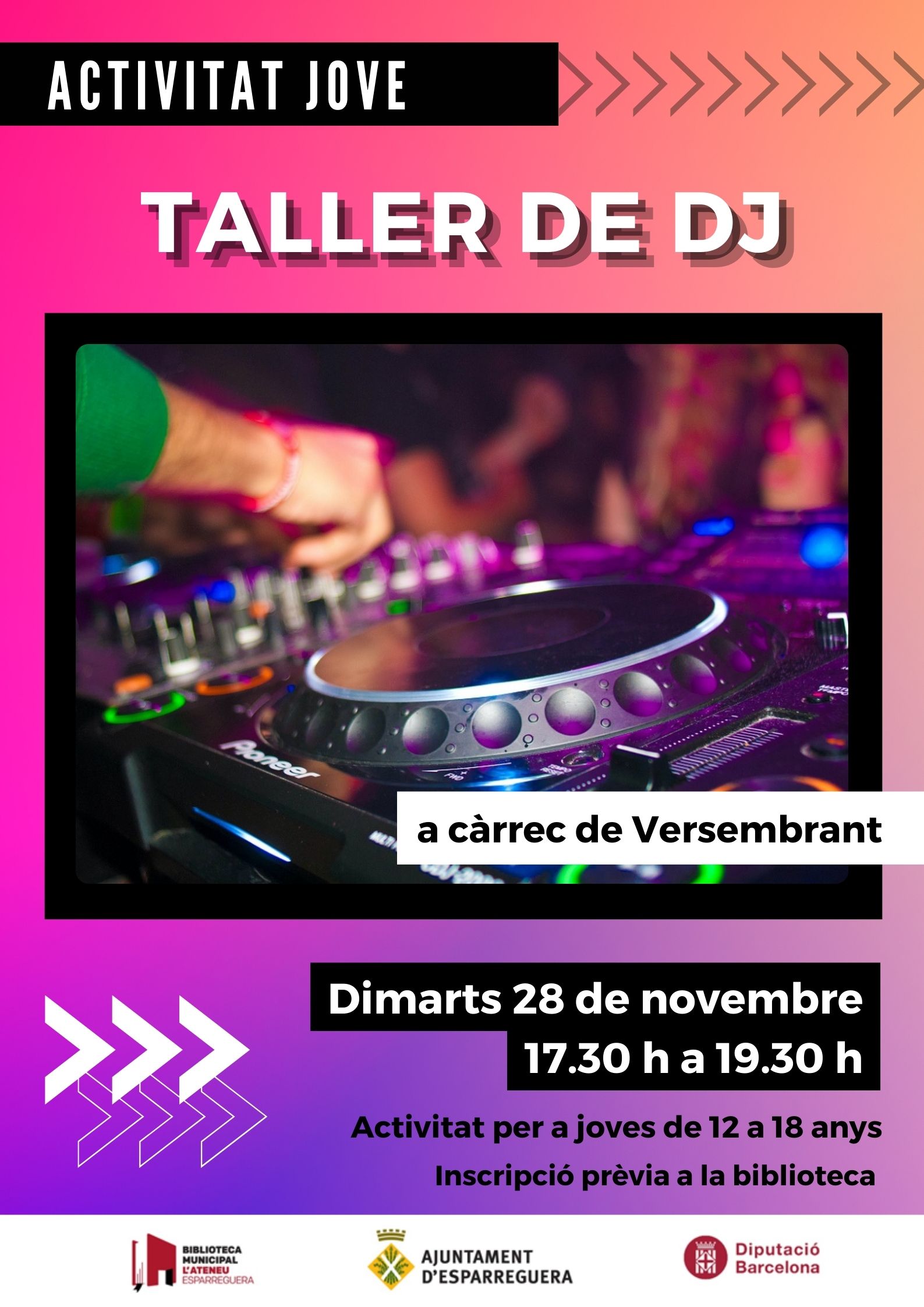Els joves d'Esparreguera tenen una cita al Taller de Dj que tindrà lloc a la Biblioteca el dimarts 28 de novembre, a les 17.30 hores. Els professionals de Versembrant explicaran què és el mixing, el cuting, el turntablism i tot allò que cal per crear una sessió de dj. El taller és per a joves a partir de 12 anys i tindrà una durada de 2 hores.