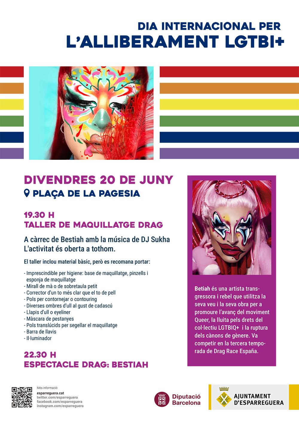 En el marc del Dia per l'alliberament Lesbià, Gai, Transexual, Bisexual i Intersexual que se celebra el 28 de juny, la regidoria de Feminismes i LGTBI organitza el divendres 20 de juny un taller de maquillatge Drag a càrrec de BESTIAH. El taller tindrà lloc a les 19.30 h a la plaça de la Pagesia i estarà dinamitzat per la música en directe de DJ Sukha.