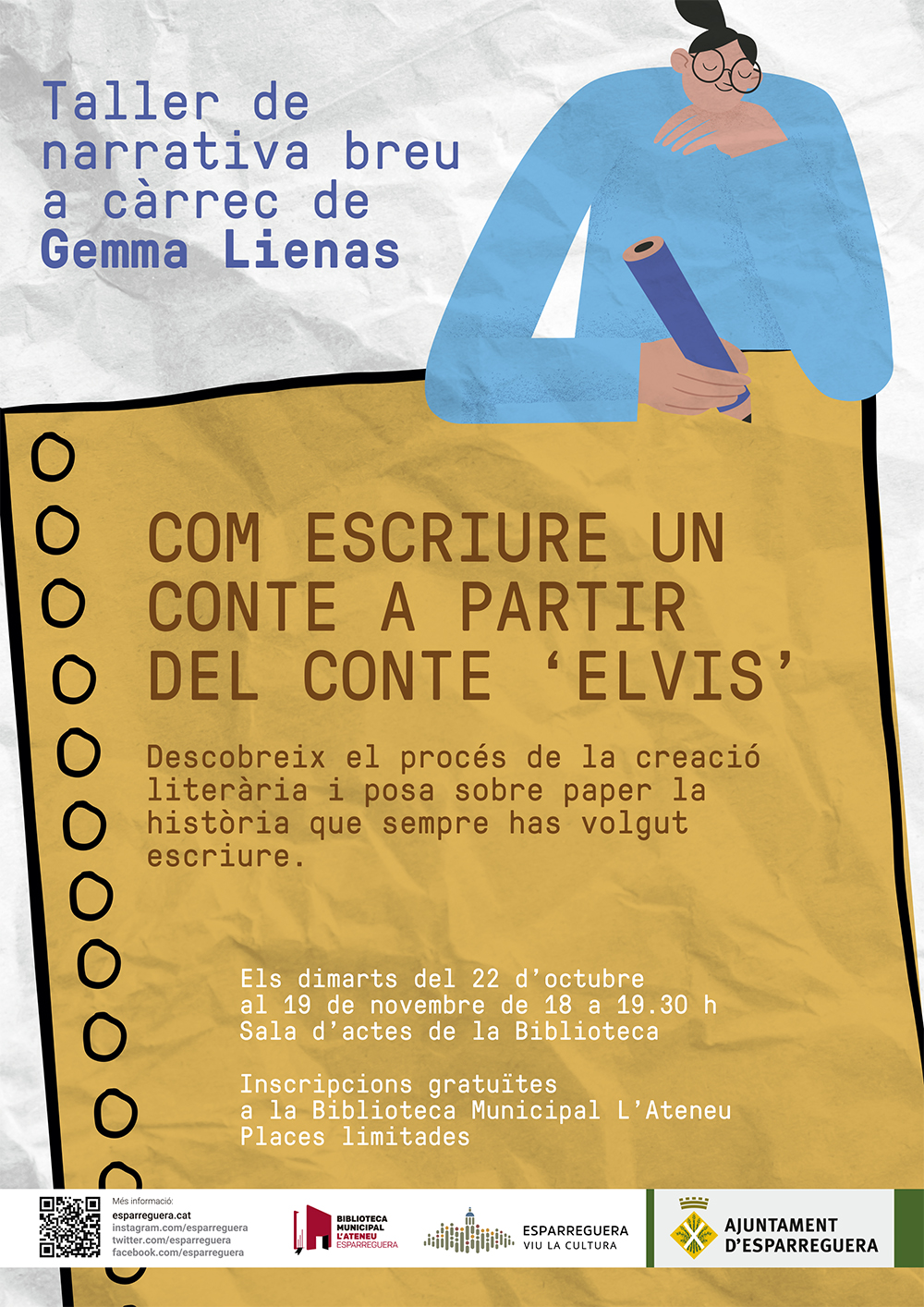La Biblioteca ofereix un taller de narrativa breu a càrrec de Gemma Lienas. El taller és una aproximació a les diferents fases del procés de creació literària: des d'on trobar les idees fins com desenvolupar un argument, passant per la creació dels personatges, del lloc i del temps, per la captació de l'atenció del lector o per la tria de la veu narrativa, de manera que l’exercici final serà escriure un conte.