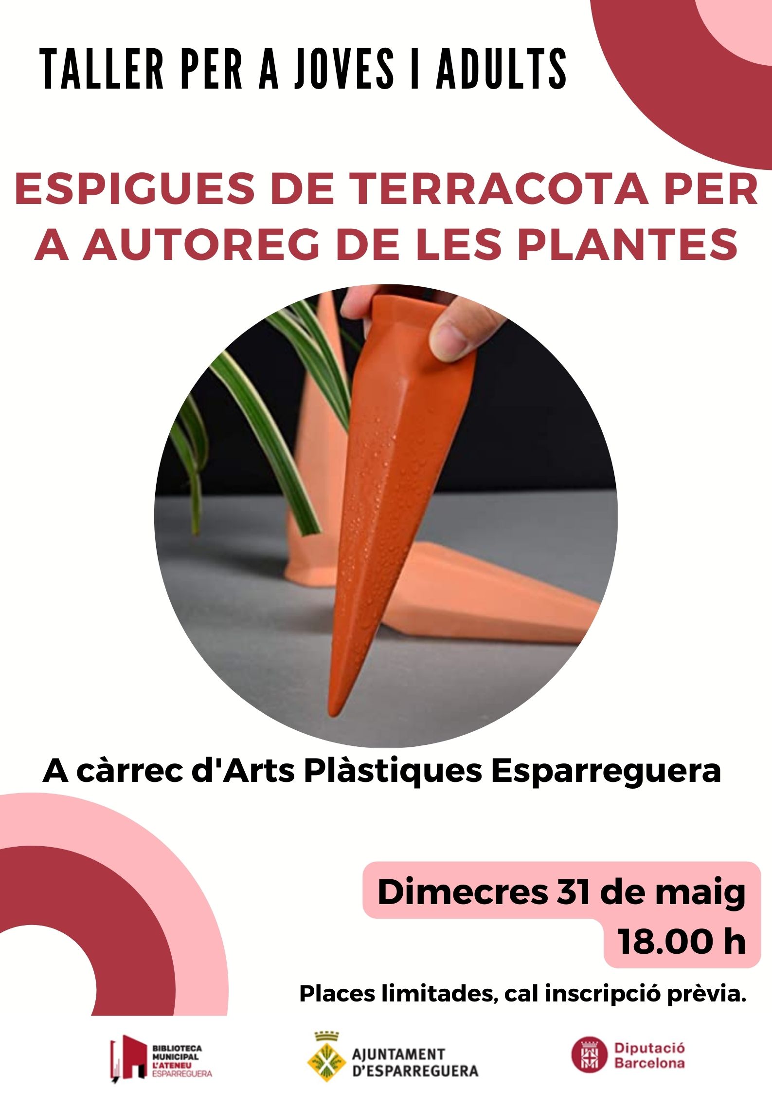 En el marc de la Setmana de la Natura la Biblioteca organitza el taller per a joves i adults "Espigues de terracota per a autoreg de les plantes", a càrrec d'Arts Plàstiques Esparreguera. L'activitat tindrà lloc el dimecres 31 de maig a les 18 hores.
