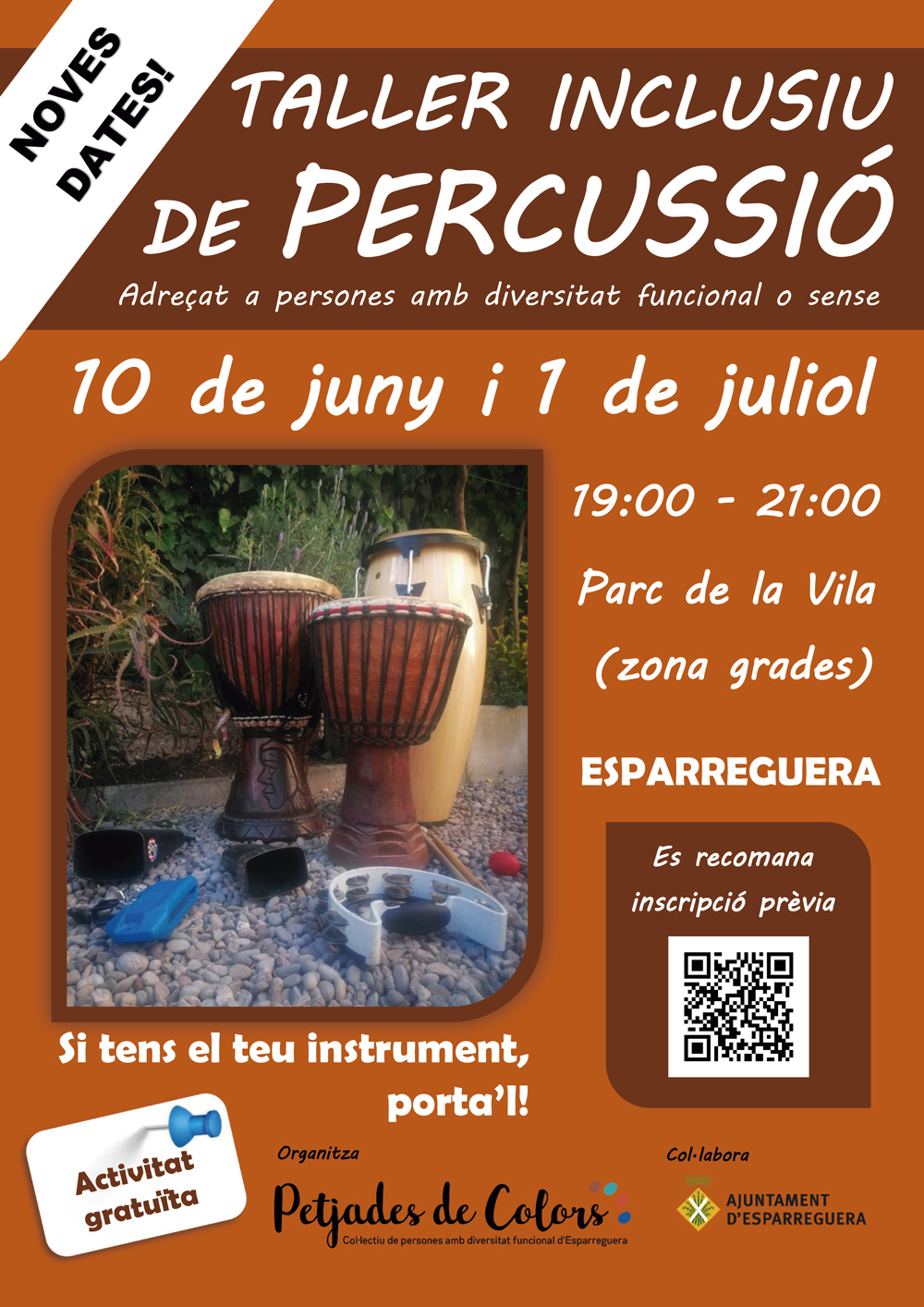 L'associació Petjades de Colors organitza un taller de percussió amb l'objectiu d'afavorir la integració, la convivència i la comunicació de persones amb diversitat funcional en el món de la percussió com a eina per al desenvolupament personal. Per a participar-hi no cal tenir cap mena de coneixement previ, només tenir ganes de fer música i compartir amb persones diverses.