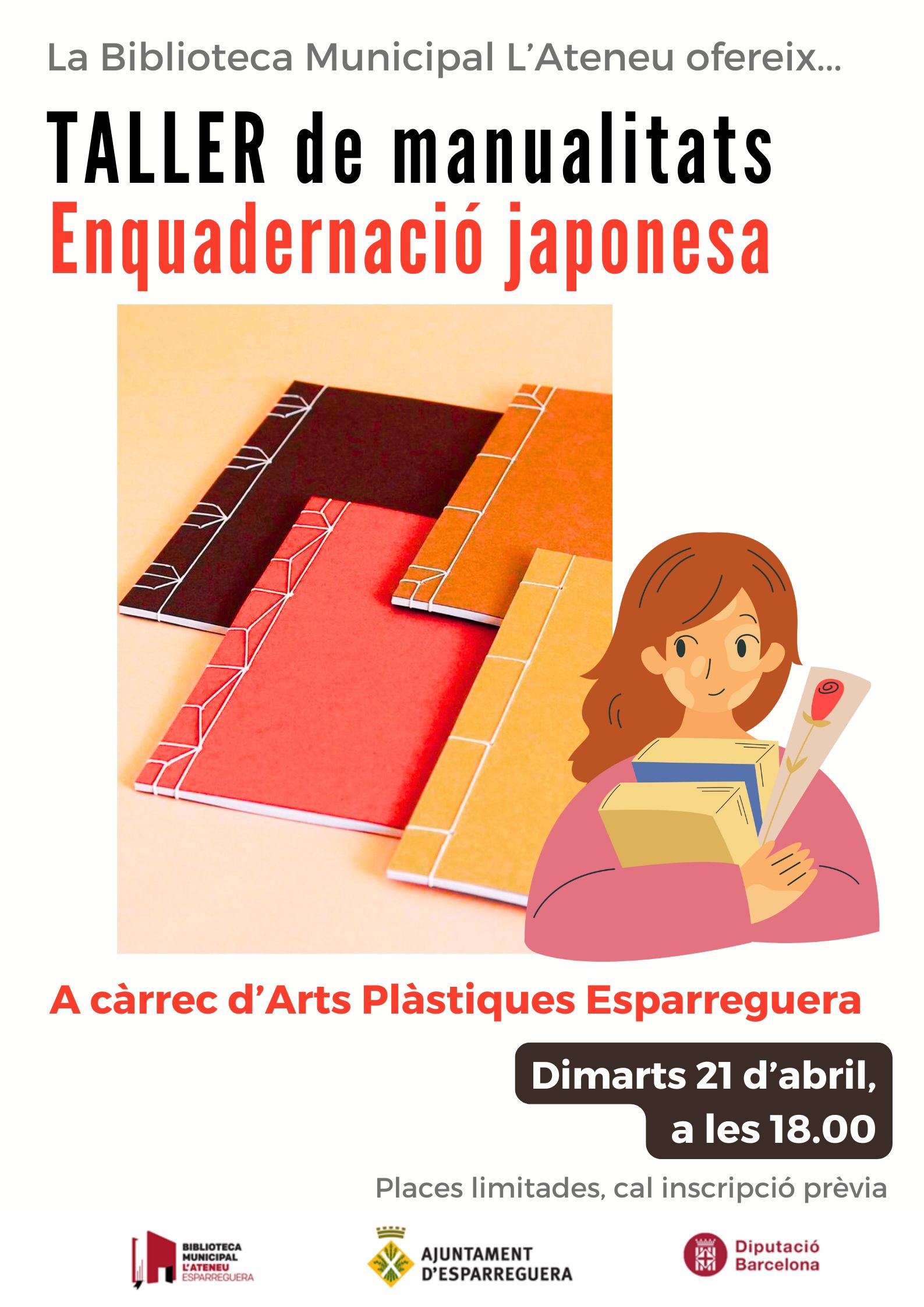 El dimarts 21 d'abril, a les 18.00 h, la Biblioteca començarà a celebrar Sant Jordi al taller creatiu per a adults d'enquadernació japonesa. Amb la Nicole d'Arts Plàstiques Esparreguera descobrirem aquesta tècnica de llarga tradició i reconeixement i crearem una petita llibreta. L'activitat tindrà una durada d'1 h 30 min.