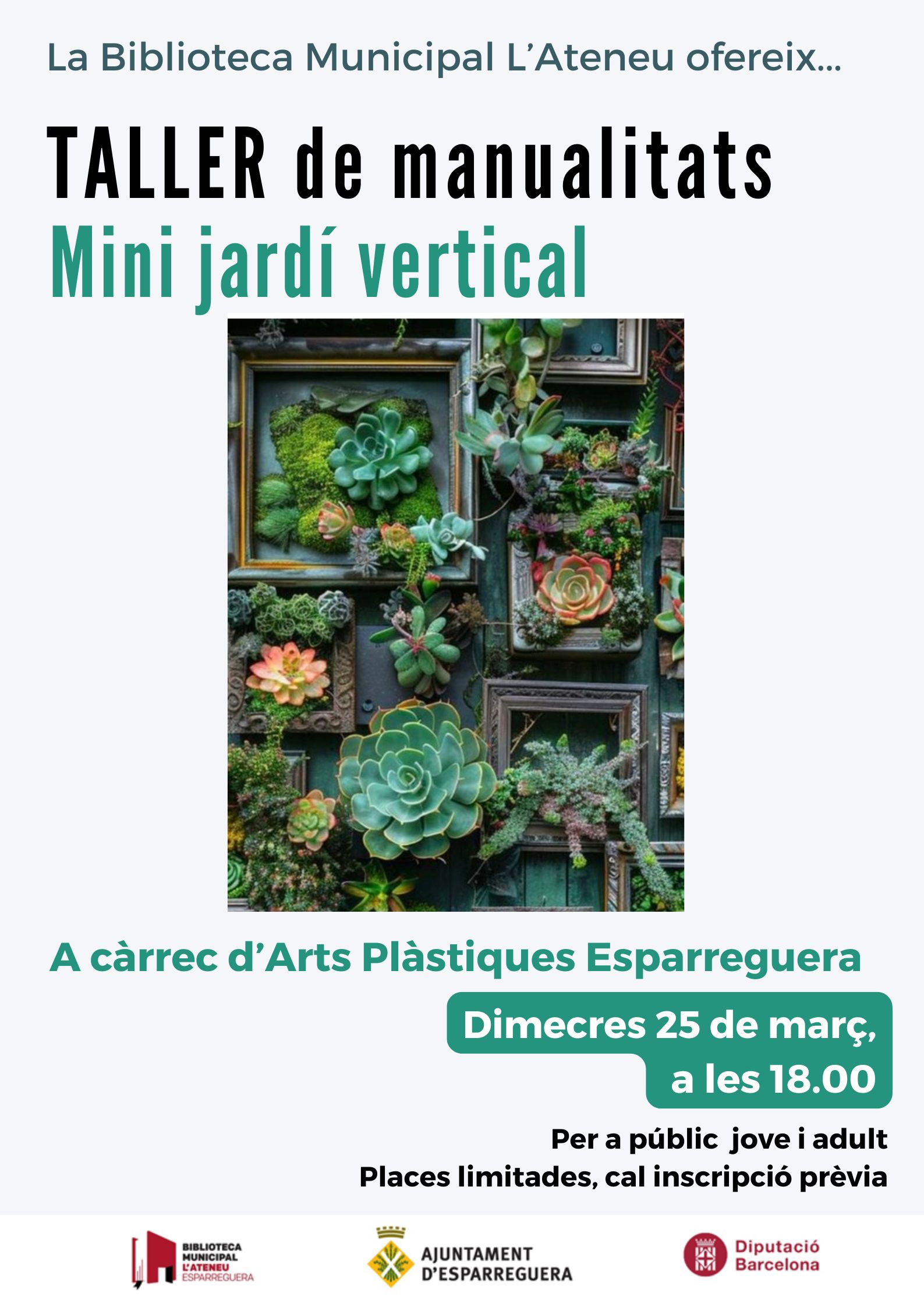 El dimecres 25 de març, a les 18.00 h, tindrà lloc a la Biblioteca un nou taller creatiu per a adults on construirem un mini jardí vertical. Ens prepararem per a la primavera amb la Nicole d'Arts Plàstiques Esparreguera en una sessió de 1h 30 minuts pensada per a joves i adults.