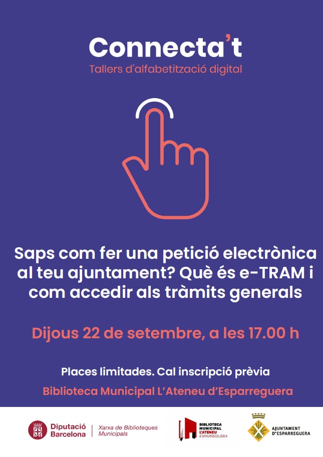 La Biblioteca ofereix el Taller Connecta't d'alfabetització digital per a adults "Saps com fer una petició electrònica al teu ajuntament? T’expliquem que és e-TRAM o com accedir als tràmits generals".