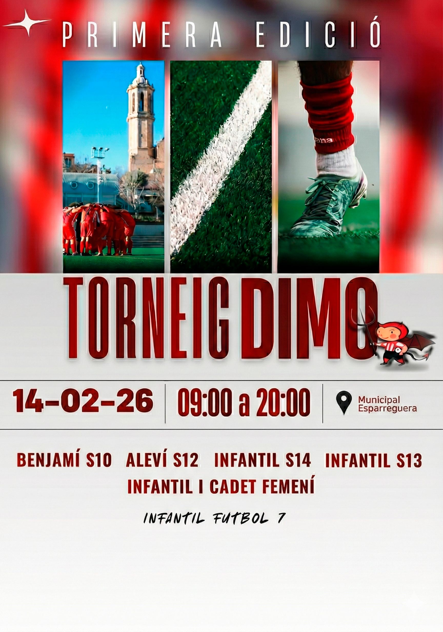 Dissabte 14 de febrer tindrà lloc, al camp municipal d'esports, el 1er torneig DIMO de futbol 7, amb participació de diferents equips de categories Benjamí S10, Aleví S12, Infantil S13 i Infantil S14 masculí, i Infantil i Cadet femení.