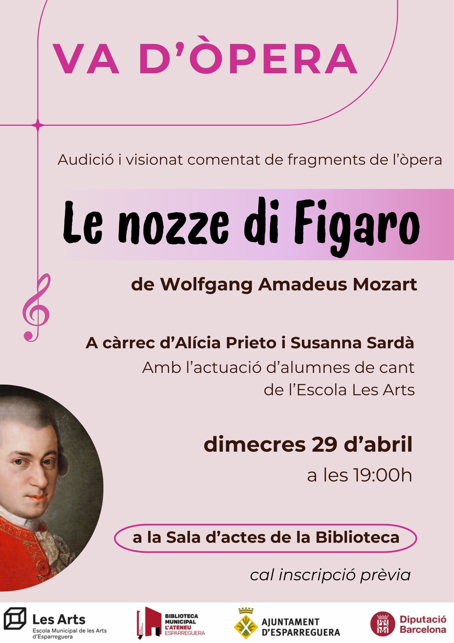 El darrer 'Va d'òpera' del curs serà una sessió especial dedicada a "Le nozze di Figaro", de Wolfgang Amadeus Mozart, on gaudirem de l'audició i visionat comentat de fragments de l'obra. La sessió anirà a càrrec d'Alícia Prieto, professora de l'Escola Municipal de Les Arts, i de Susanna Sardà, de la Biblioteca Municipal L'Ateneu, i comptarà amb l'actuació d'alumnat de cant de l'Escola Municipal de Les Arts.