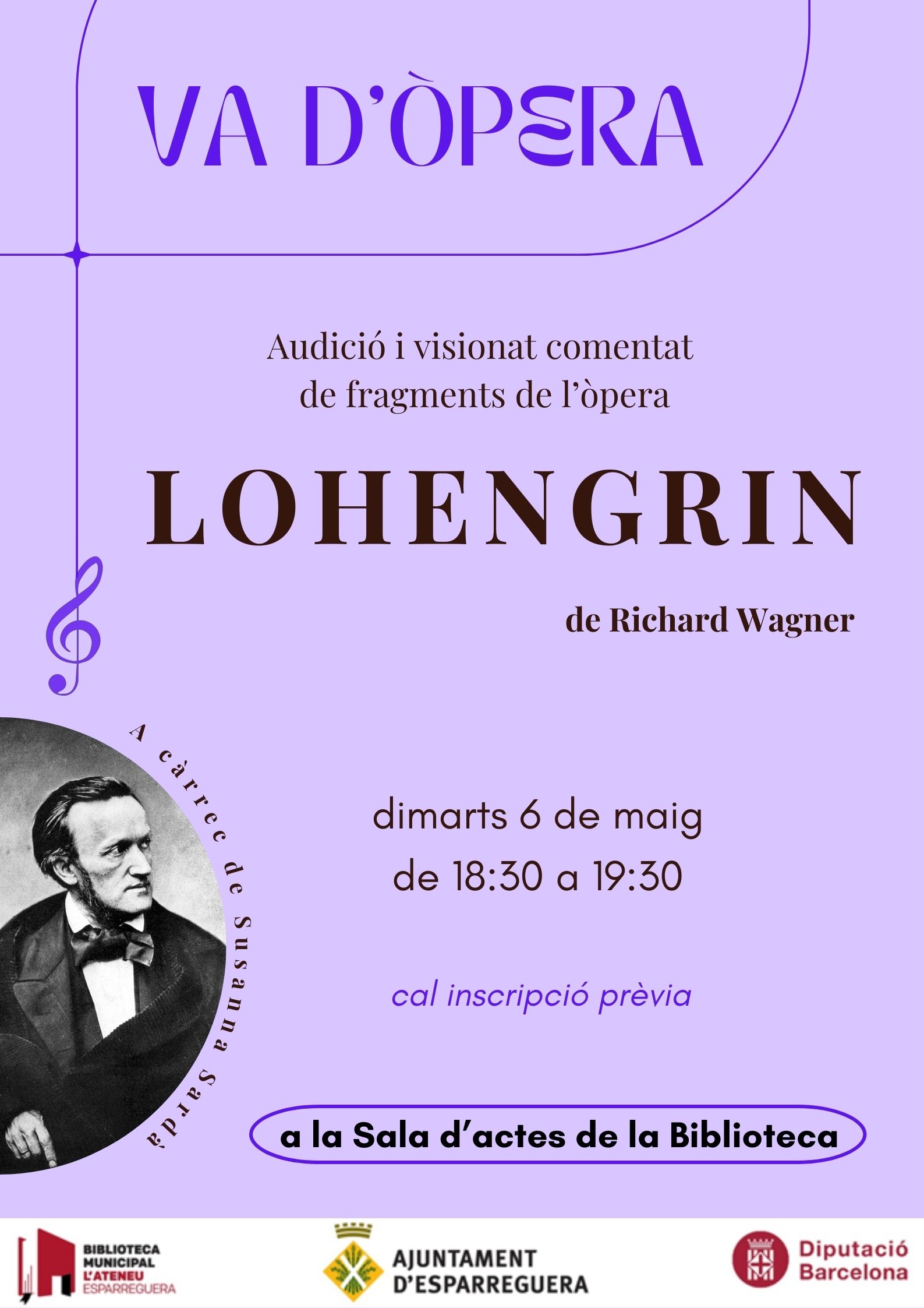 El dimarts 6 de maig la Biblioteca acull una nova sessió de "Va d'òpera". En aquesta ocasió la trobada estarà dedicada a "Lohengrin" de Richard Wagner, amb l'audició i visionat comentat de fragments de l'òpera.
