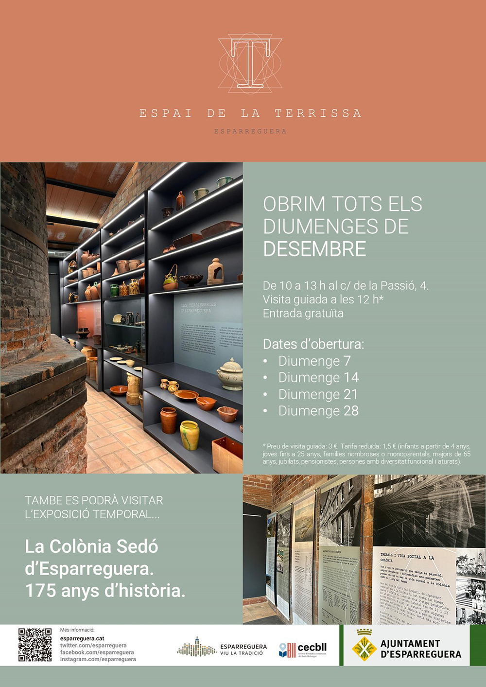 L’Espai de la Terrissa obrirà tots els diumenges de desembre amb entrada gratuïta. L'espai ens endinsa en l’art de dominar l’aigua, la terra i el foc i ens apropa a una tradició encara viva gràcies a noves propostes d’artesania, disseny i indústria. Compta amb el darrer forn de llenya per a la cocció de la terrissa conservat a la vila, pertanyent a la Terrisseria Sedó, i amb una col·lecció de peces populars i utilitàries procedents dels diversos tallers de terrissa de la vila. Des del diumenge 7 de setembre compta amb l'exposició temporal La Colònia Sedó d’Esparreguera. 175 anys d’història.
