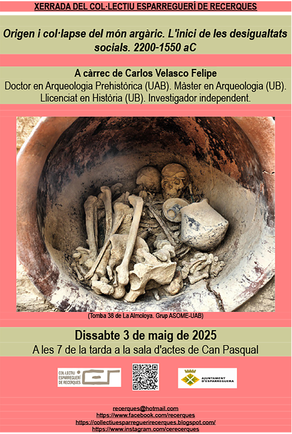 El Col·lectiu Esparreguerí de Recerques organitza el dissabte dia 3 de maig la xerrada "Origen i col·lapse del món argàric. L'inici de les desigualtats socials. 2200-1550 aC", a càrrec del doctor en Arqueologia Prehistòrica Carlos Velasco Felipe. L'acte tindrà lloc a les 19 h a la sala d'actes de Can Pasqual.