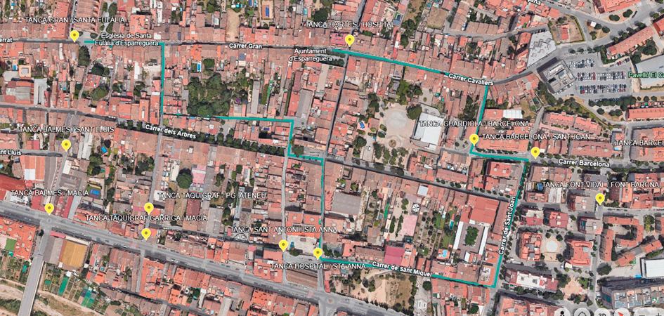 Recorregut: plaça de Santa Eulàlia, carrer Gran, plaça de l’Ajuntament, carrer de l’Hospital, plaça de Santa Anna, carrers de Sant Antoni, dels Arbres i del Taquígraf Garriga i plaça de Santa Eulàlia.