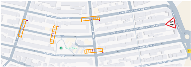 Amb motiu de la Festa Major de La Plana, des de les 8 h del dimecres 10 de setembre fins a les 23.50 h del diumenge 14 de setembre, el trànsit de vehicles restarà tallat als carrers Joan XXIII, entre els carrers Ramón i Cajal i Pintor Fortuny, i al carrer Jacint Benavent, entre els carrers Prínceps d'Espanya i Mossèn Cinto Verdaguer.