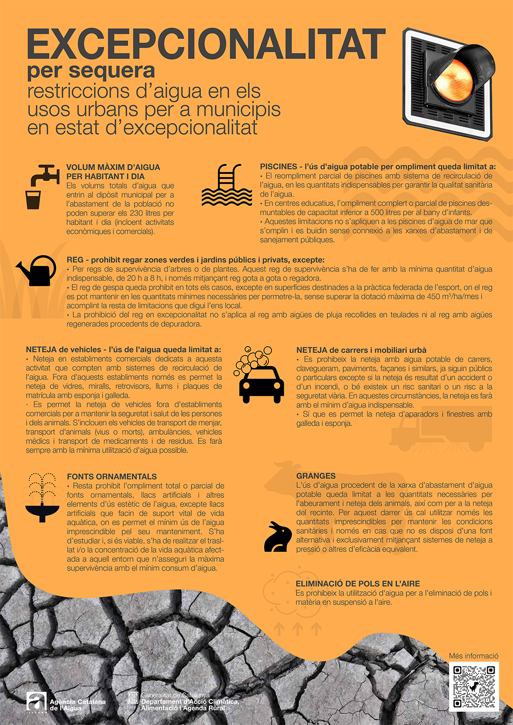 A causa de la situació de sequera que viu Catalunya, el Govern de la Generalitat i l'Agència Catalana d'Aigües han activat la fase d’excepcionalitat del sistema Ter-Llobregat i de l'aqüífer del Fluvià Muga, que avui entra en vigor arran la publicació del Decret Llei 1/2023, de 28 de febrer, pel qual s'estableixen mesures extraordinàries i urgents per fer front a la situació de sequera excepcional en l'àmbit del districte de conca fluvial de Catalunya. L'excepcionalitat afectarà 224 municipis de 15 comarques, amb un abast de prop de 6 milions d'habitants.