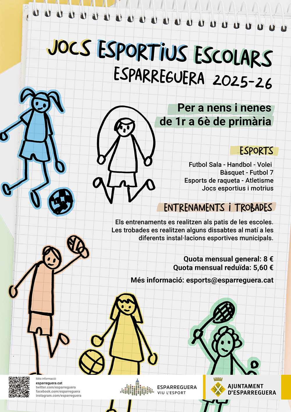 Els Jocs esportius escolars començaran al setembre, seguiran el calendari escolar, i es realitzaran com a extraescolars en diferents dies segons l'escola. Les inscripcions es poden realitzar presencialment, al Servei d'esports municipal ubicat a la Piscina de Can Pasqual, o per correu electrònic a [email protected].