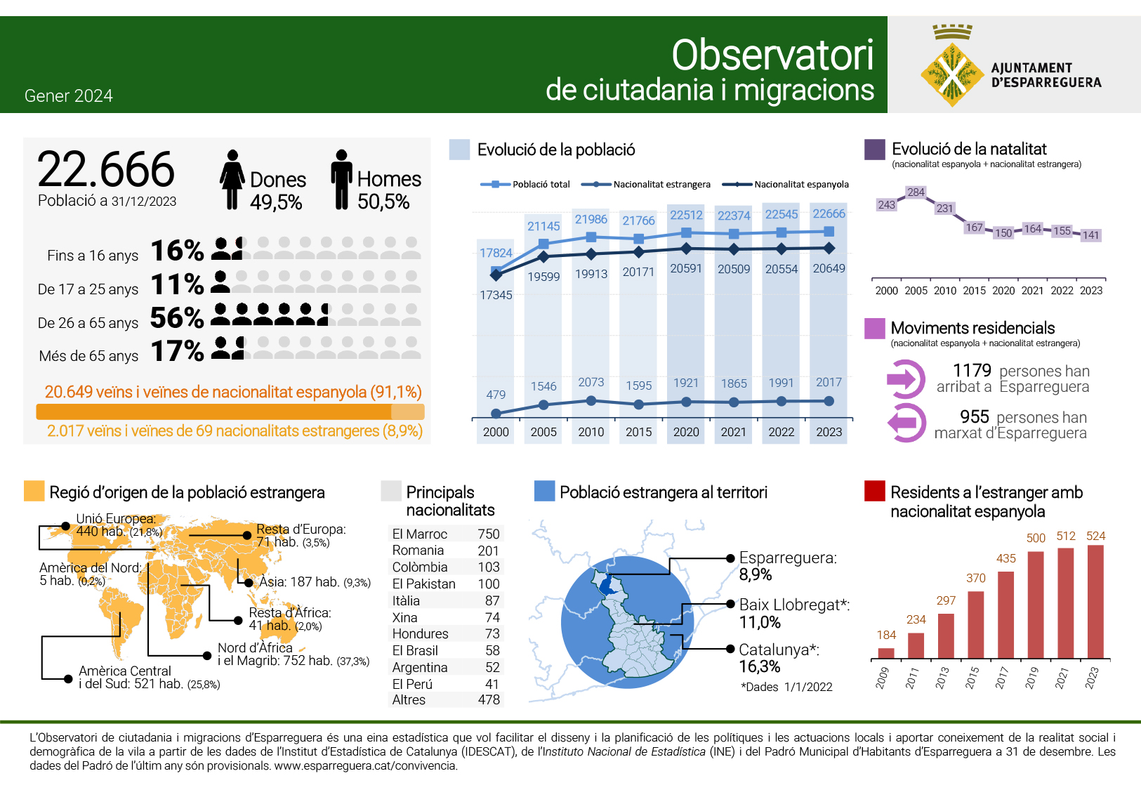 L’Observatori de ciutadania i migracions d’Esparreguera vol ser una eina estadística i d’interpretació que faciliti el disseny i la planificació de les polítiques i les actuacions locals i ajudi a conèixer la realitat social de la vila.