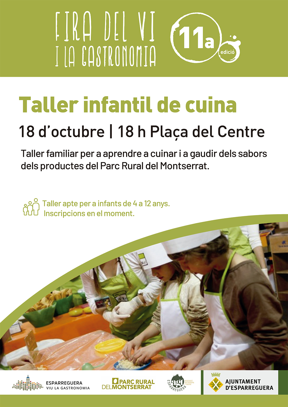 En el marc de l'11a edició de la Fira del Vi i la Gastronomia d'Esparreguera, el 18 d'octubre a les 18 h hi haurà un taller de cuina infantil amb productes de Parc Rural del Montserrat.