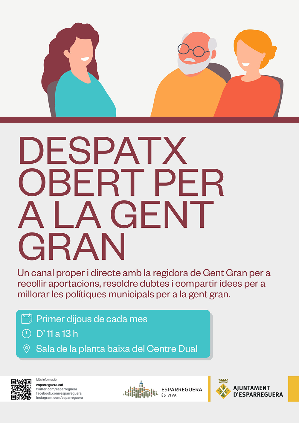 La Regidoria de la Gent Gran impulsa la creació del Despatx Obert per a la Gent Gran, un nou espai de trobada i escolta activa adreçat a la població major de 60 anys. L'espai vol esdevenir un canal proper i directe amb la regidora de Gent Gran, Sandra Chaparro, per a recollir aportacions, resoldre dubtes i compartir idees per a millorar les polítiques municipals per al col·lectiu de persones grans d’Esparreguera.