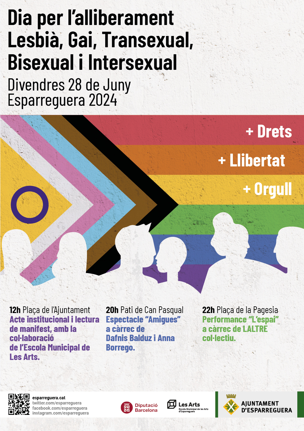 Esparreguera celebra divendres 28 de juny el Dia per l'alliberament Lesbià, Gai, Transexual, Bisexual i Intersexual sota el lema "Més drets, més llibertat, més orgull", amb aquest programa d'actes: