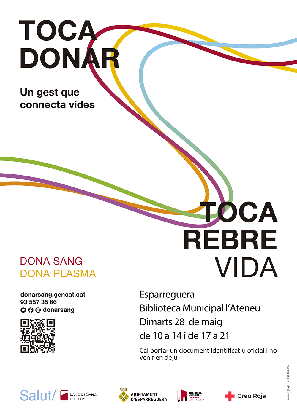 El dimarts 28 de maig, el Banc de Sang i Teixits de Catalunya instal·larà un centre de donació de sang i plasma a la Biblioteca Municipal l'Ateneu. El Banc de Sang necessita un miler de donacions diàries per abastir els hospitals catalans i tenir una bona reserva en cas d'eventualitats. Caldrà fer inscripció prèvia.