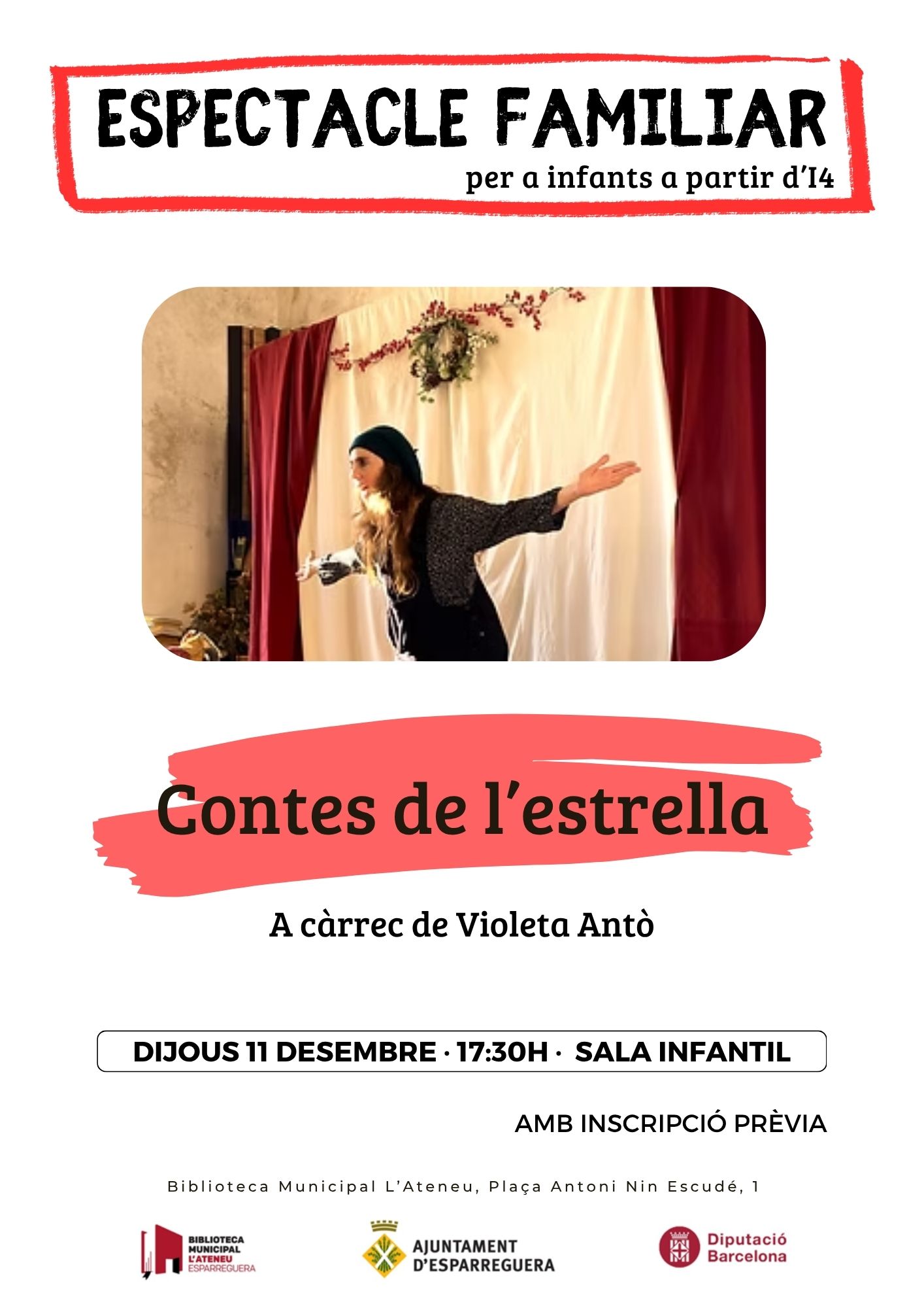El dijous 11 de desembre, a les 17.30 h, la Biblioteca organitza l'espectacle familiar "Contes de l'estrella", una sessió de contes de Nadal plena de sonoritat i cançons. Una estrella viatja a través de contes per a descobrir-nos històries plenes d'emoció. Reis, tions, avets, camells i altres personatges ens acompanyen per a recordar-nos els valors de l'esperit de Nadal. L’activitat anirà a càrrec de Violeta Antò i està pensada per a infants a partir d’Infantil 4 (I4) acompanyats d’un adult.