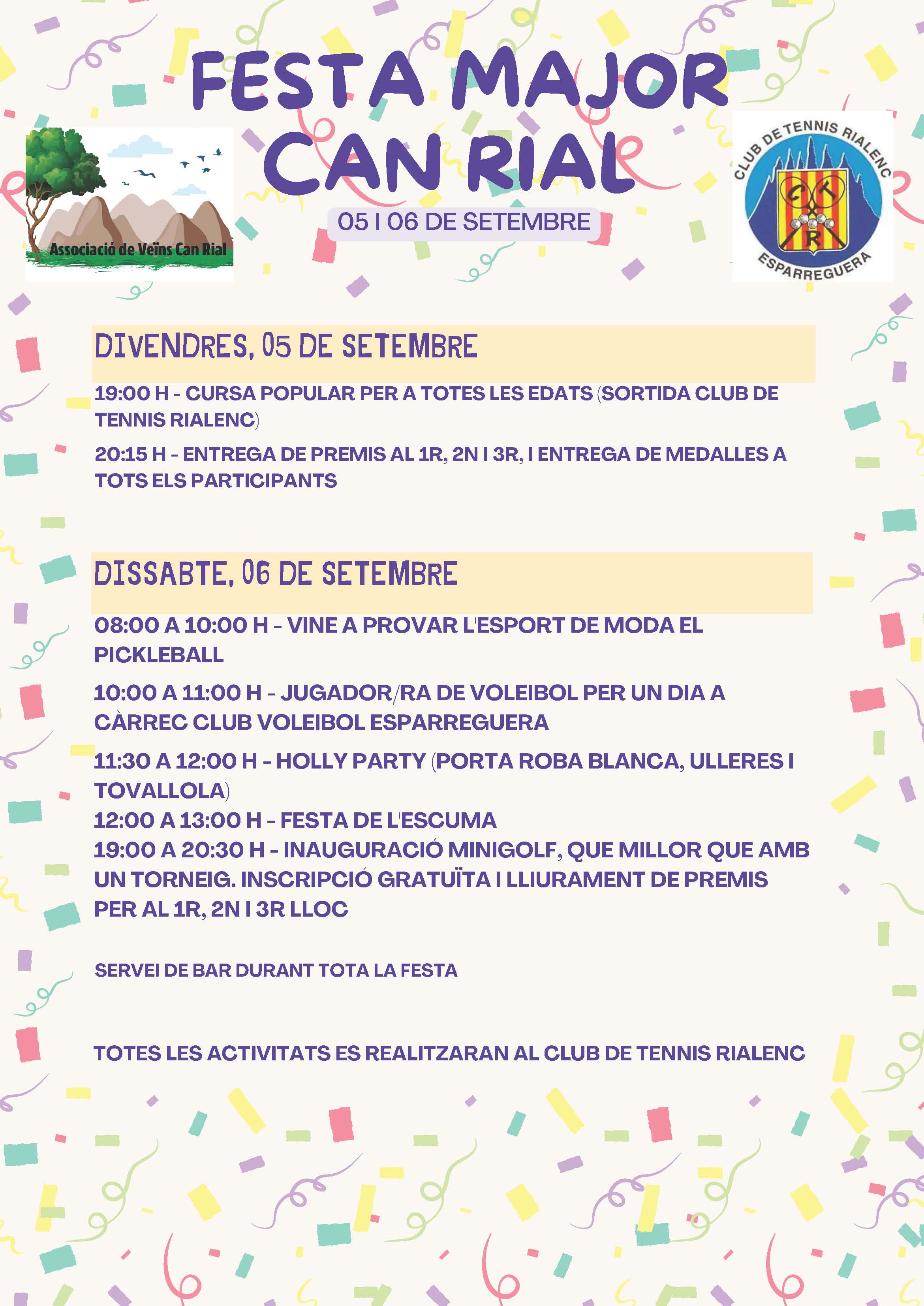 L'Associació de veïnes i veïns de Can Rial i el Club de Tennis Rialenc organitzen la Festa Major del barri, que tindrà lloc els dies 5 i 6 de setembre, amb tot un seguit d'activitats lúdiques i esportives per a totes les edats.
