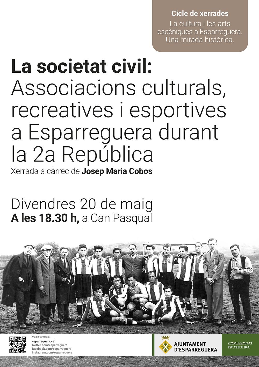 Aquesta primera xerrada anirà a càrrec de l'historiador local Josep Maria Cobos i portarà per títol "Associacions culturals, recreatives i esportives durant la 2a República".