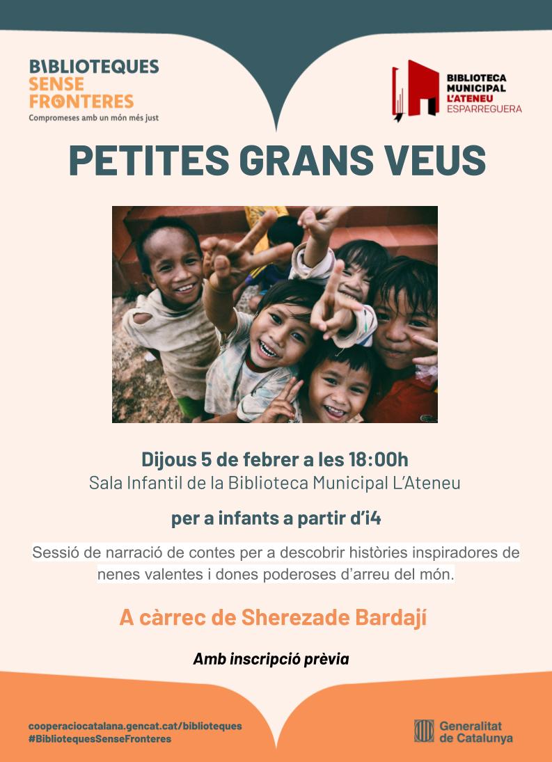 El dijous 5 de febrer, a les 18.00 hores us esperem a la sessió de narració de contes "Petites grans veus" per descobrir històries inspiradores de nenes valentes i dones poderoses d’arreu del món. A través de relats curts, la Sherezade Bardají ens transportarà a països com Bolívia, Kenya o l'Índia per conèixer la força, el coratge i la lluita de dones que transformen el món. Una experiència per compartir, imaginar i aprendre plegats com es defensen els drets humans a diferents territoris. L'activitat està pensada per a infants a partir d'Infantil 4 (I4) acompanyats d'un adult.
