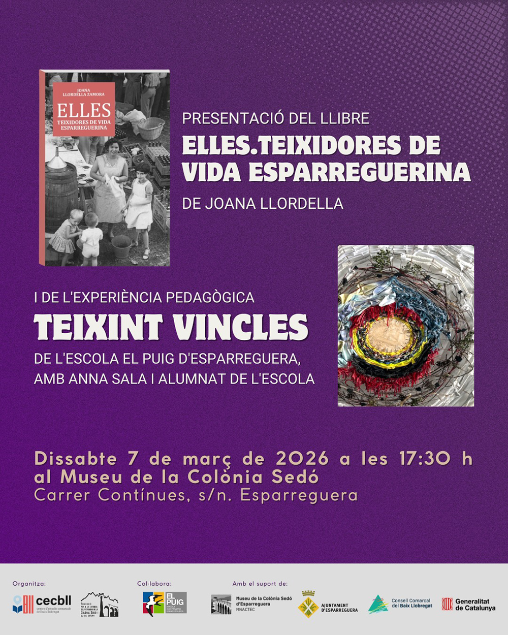 El Centre d'Estudis Comarcals del Baix Llobregat (CECBLL) i l'Associació per a la defensa del patrimoni de la Colònia Sedó i el seu entorn organitzen, el dissabte 7 de març, la presentació del llibre "Elles. Teixidores de vida esparreguerina", de Joana Llordella, així com de l’experiència pedagògica "Teixint vincles", impulsada per l’escola cooperativa El Puig d’Esparreguera. L’acte comptarà amb la participació d’Anna Sala i alumnat del centre, i tindrà lloc a les 17.30 h al Museu de la Colònia Sedó.
