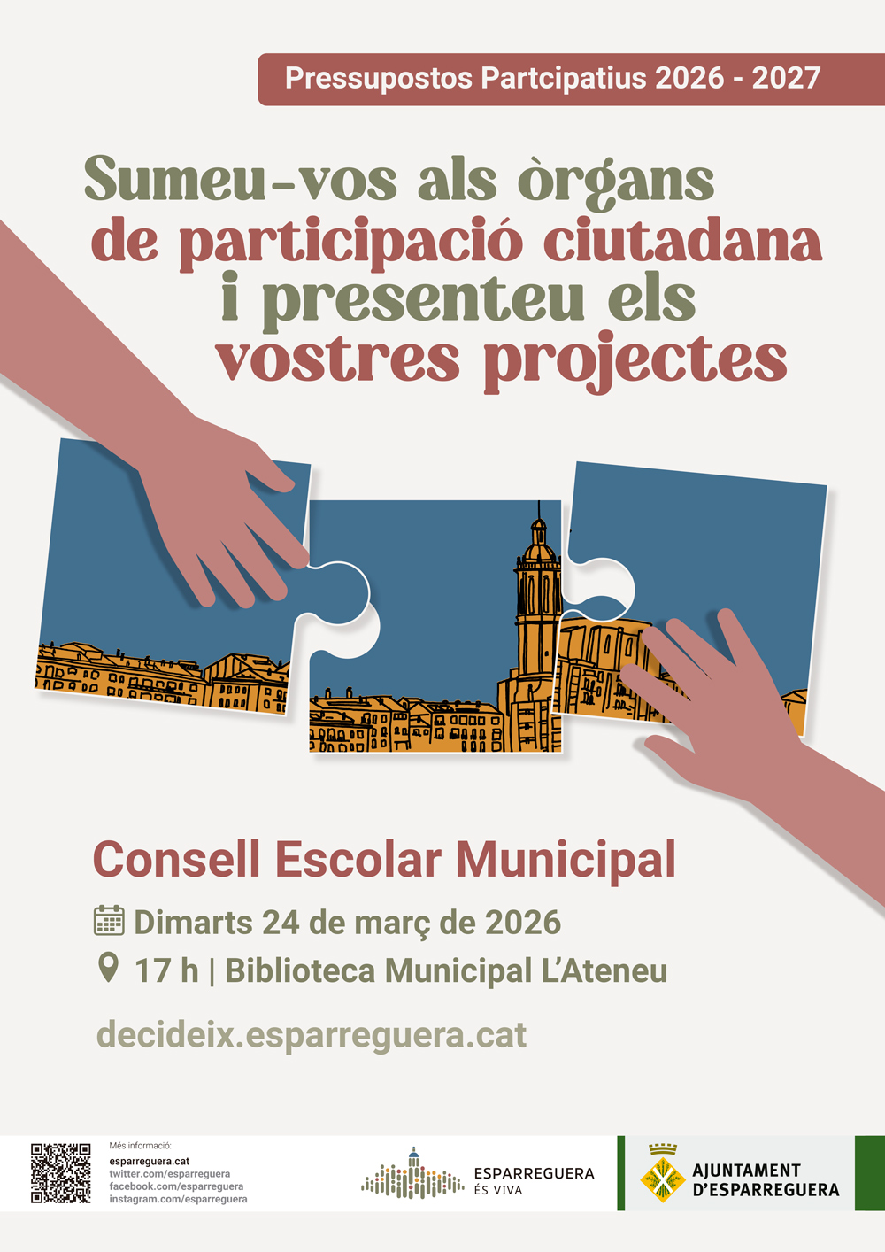 En el marc del procés de Pressupostos Participatius 2026-2027, el dimarts 24 de març a les 17h a la sala d'actes de la Biblioteca Municipal L'Ateneu, tindrà lloc una trobada del Consell Escolar Municipal amb l'objectiu de presentar les novetats i el calendari de la present edició i configurar les propostes pròpies d'aquest àmbit per part de les entitats i col·lectius assistents.