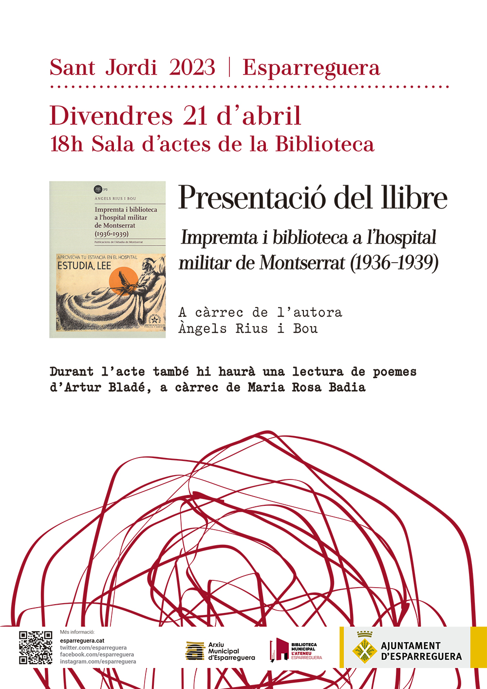 El divendres 21 d’abril es presentarà el llibre Impremta i biblioteca a l'hospital militar de Montserrat (1936-1939), a càrrec de la seva autora Àngels Rius i Bou. La presentació serà a les 18 h a la sala d'actes de la Biblioteca Municipal L'Ateneu i durant l'acte també es farà una lectura de poemes d’Artur Bladé a càrrec de la Maria Rosa Badia.