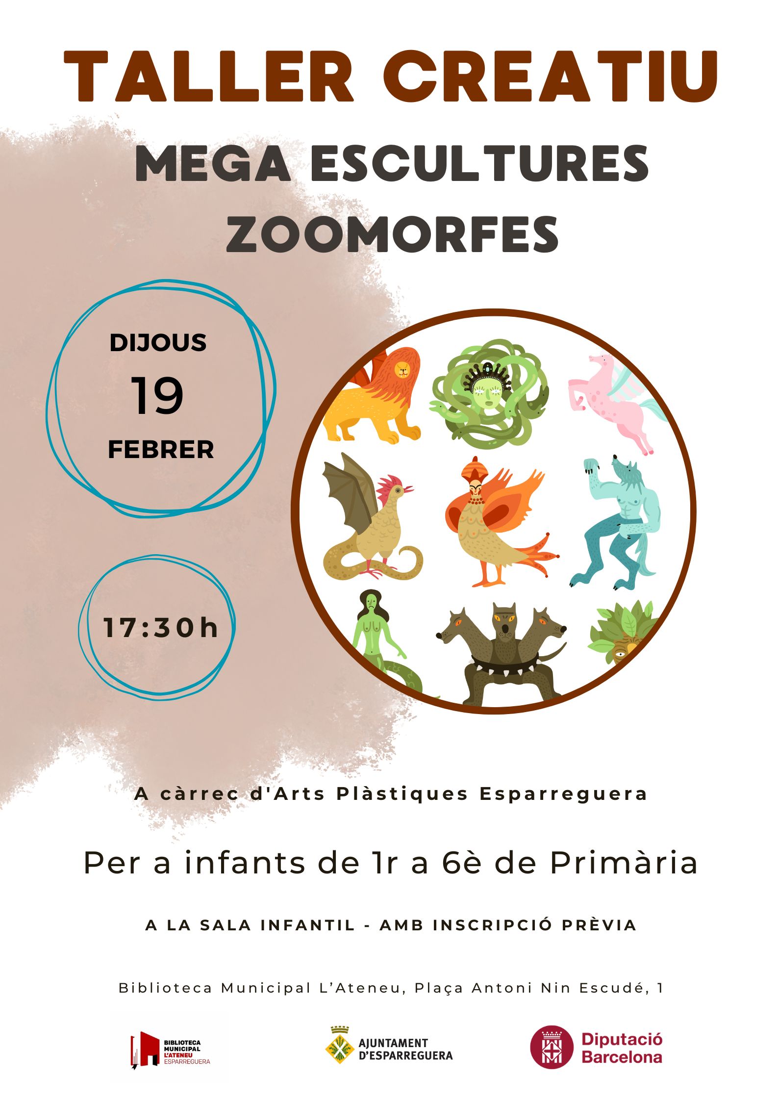 Al taller creatiu del mes de febrer farem grans escultures d'animals fantàstics amb materials naturals, tot amb l'objectiu d'entendre i conèixer alguns principis bàsics de la zoologia. L'activitat serà el dijous 19 a les 17.30 hores i anirà a càrrec d'Arts Plàstiques Esparreguera. El taller està pensat per a infants de 1r a 6è de Primària.