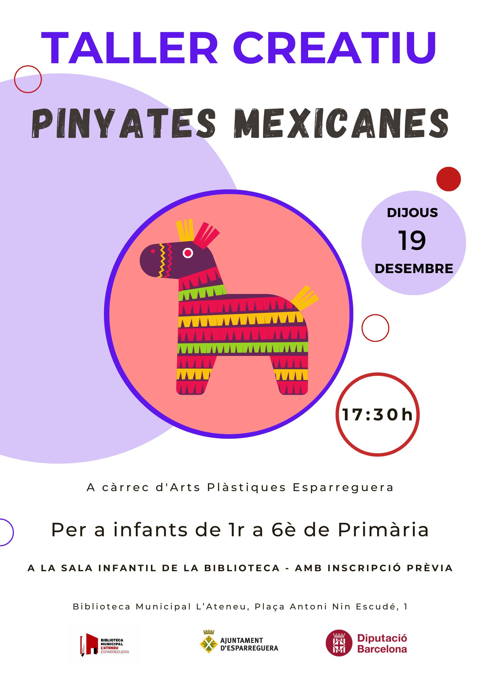 El taller de Nadal d'enguany a la Biblioteca durà els infants a fer un petit tast de la cultura mexicana! Amb Arts Plàstiques Esparreguera gaudiran de la fabricació d'unes pinyates molt acolorides per a fer encara més divertit el Nadal. L'activitat tindrà lloc el dijous 19 de desembre a les 17.30 h i està pensada per a infants de 1r a 6è de Primària.