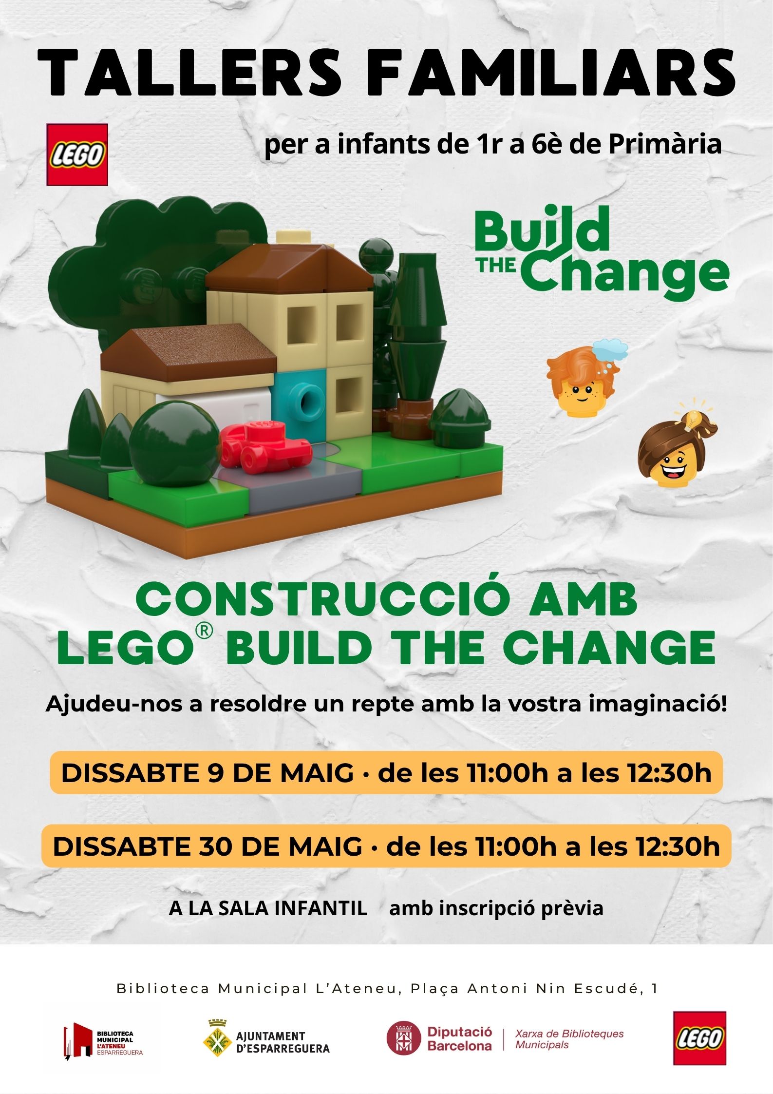 Els dissabtes 9 i 30 de maig continuem amb els reptes de #LEGOBuildTheChange! Ens ajudeu a repensar el nostre entorn a través del joc amb peces de LEGO? Els tallers seran a les 11.00h i estan pensats per a infants de 1r a 6è de Primària acompanyats d'un adult.