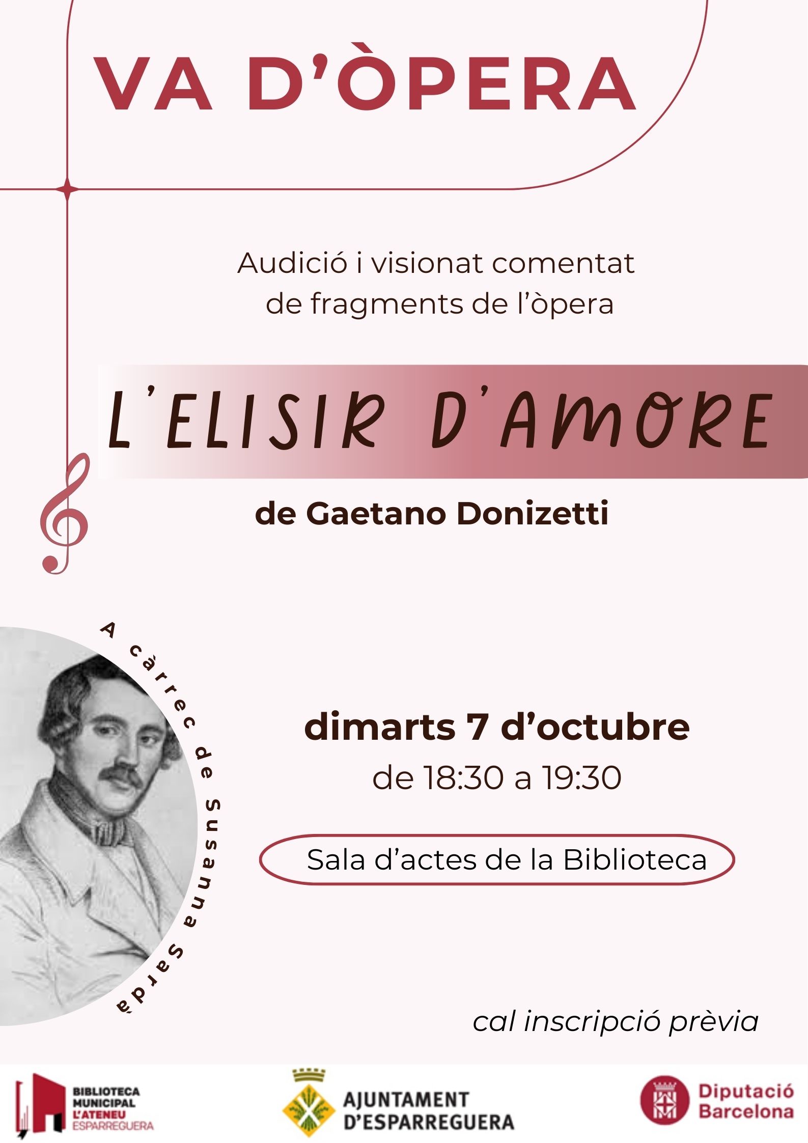 En una nova trobada de Va d'òpera, el dimarts 7 d'octubre a les 18.30 h, la Biblioteca ofereix el visionat i audició comentada de fragments de "L'elisir d'amore", de Gaetano Donizetti. Descobrirem aquest "melodramma giocoso", un gènere d'òpera còmica italiana, que gira al voltant de la força transformadora de l'amor. Activitat per a públic adult.