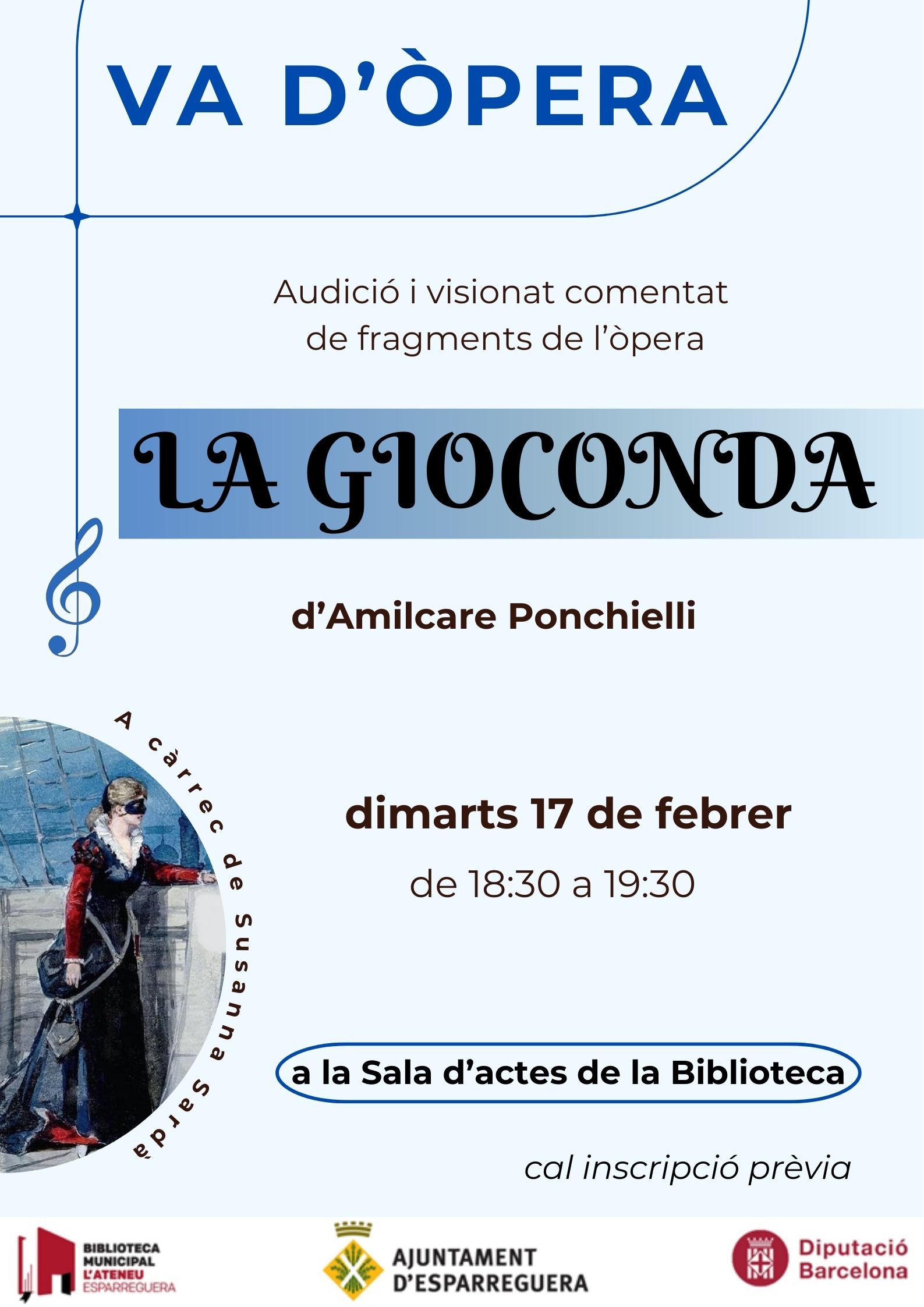 En una nova trobada de Va d'òpera, el dimarts 17 de febrer a les 18.30 h, posarem el focus a "La Gioconda", d'Amilcare Ponchielli, uns dies abans d'anar al Liceu a veure l'obra en directe. Durant la sessió gaudirem de l'audició i visionat comentat de fragments de l'obra, que segur sorprendrà pels seus girs inesperats. L'activitat està pensada per a públic adult i jove.