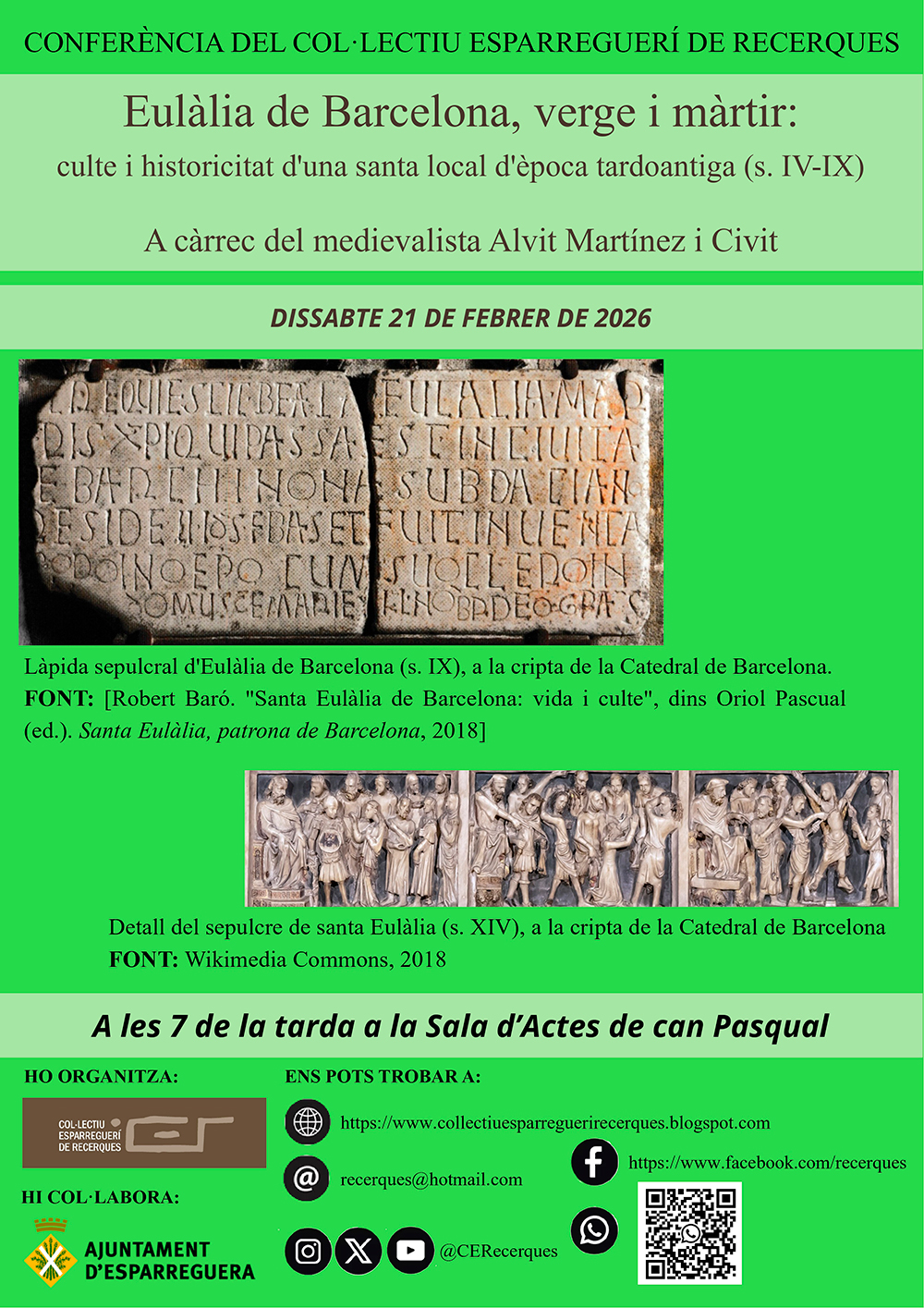 El Col·lectiu Esparreguerí de Recerques organitza el dissabte 21 de febrer la xerrada "Eulàlia de Barcelona, verge i màrtir: culte i historicitat d'una santa local d'època tardoantiga (s. IV-IX)", a càrrec del medievalista Alvit Martínez i Civit. L'acte tindrà lloc a les 19 h a la sala d’actes de Can Pasqual.