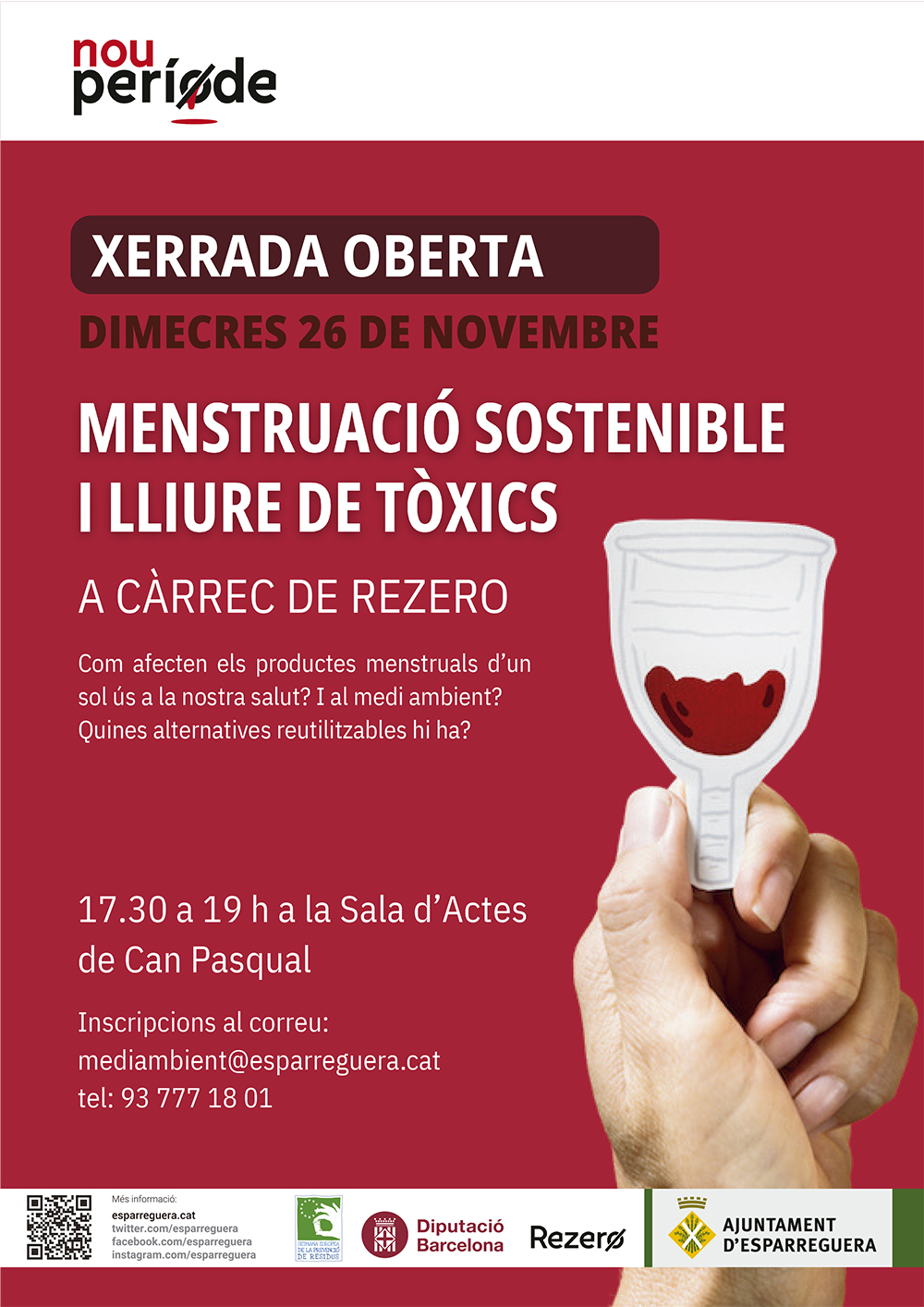 En el marc de la Setmana Europea de Prevenció dels Residus, el Servei de Medi Ambient ha programat una xerrada per a parlar sobre la menstruació sostenible i els productes reutilitzables d'higiene femenina per a reduir els residus d'un sol en aquest àmbit. La xerrada tindrà lloc el dimecres 26 de novembre, a les 17.30 h, a la sala d'actes de Can Pasqual i anirà a càrrec de la fundació Rezero, amb el suport de la Diputació de Barcelona.