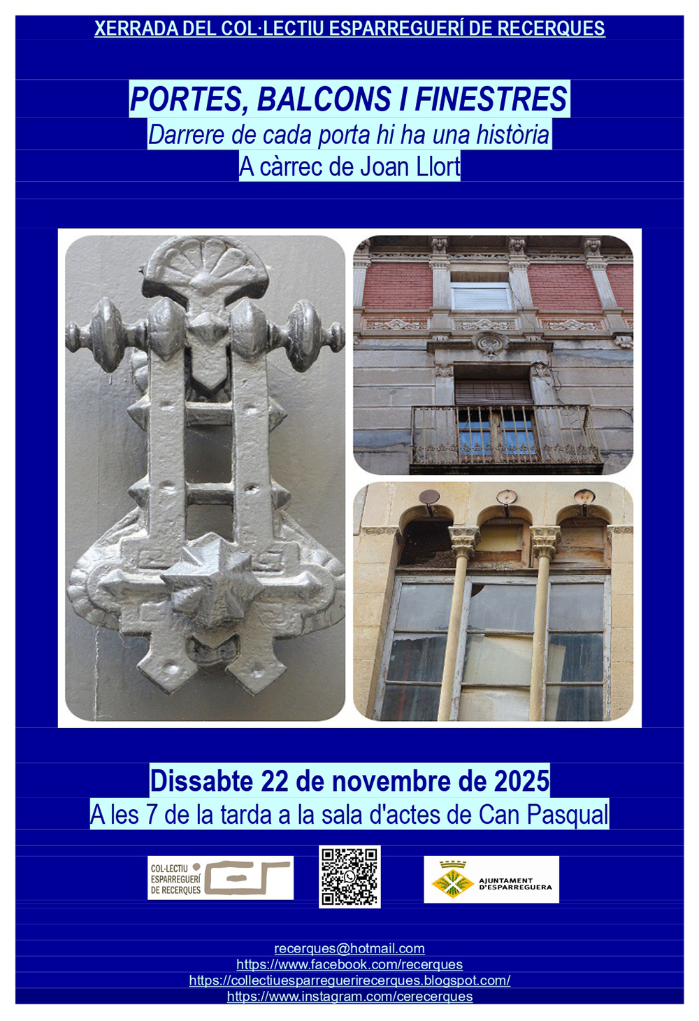 El Col·lectiu Esparreguerí de Recerques organitza el dissabte dia 22 de novembre la xerrada "Portes, balcons i finestres. Darrera de cada porta hi ha una història", a càrrec de Joan Llort i Riera, que farà un repàs d'històries i anècdotes sobre Esparreguera. L'acte tindrà lloc a les 19 h a la sala d’actes de Can Pasqual.