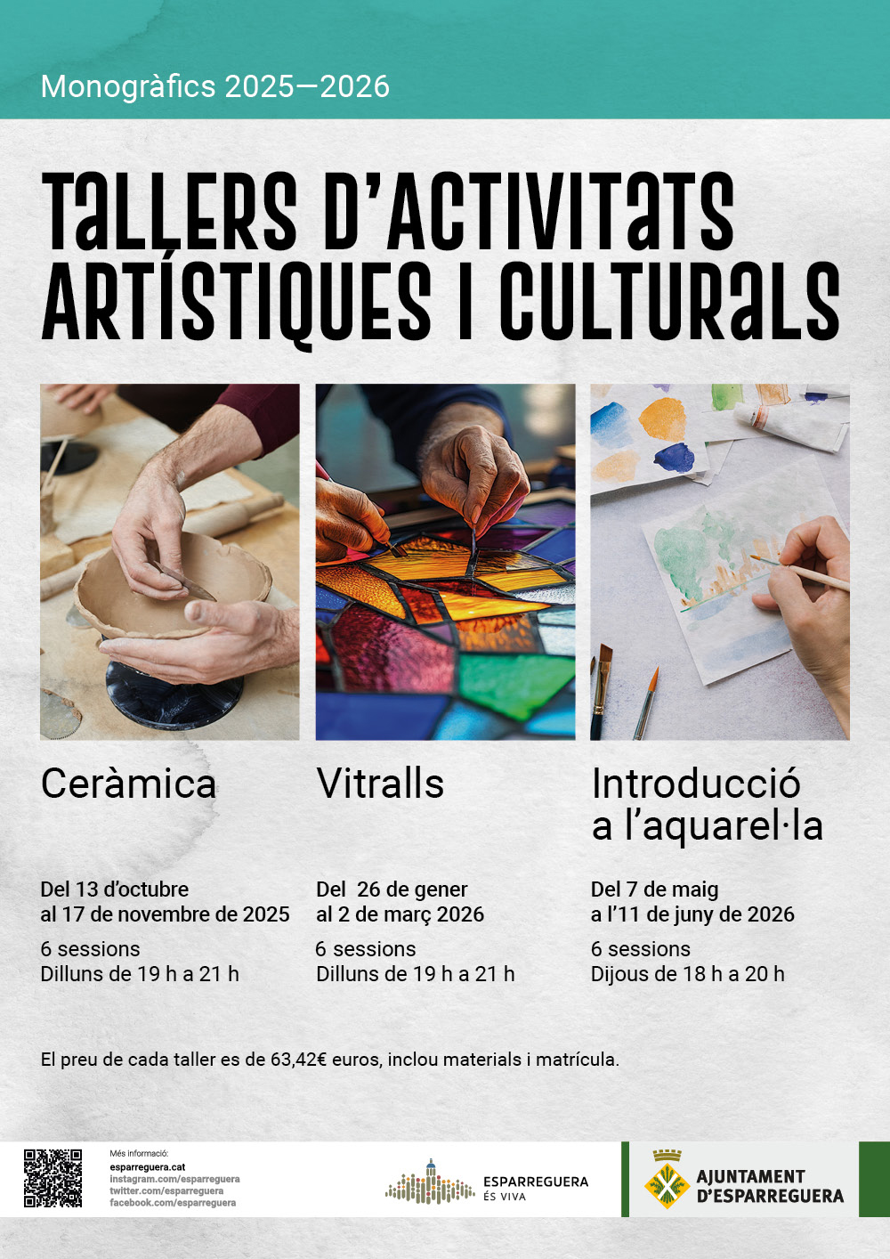 El preu del taller és de 63,42€ euros, inclou materials i matrícula.