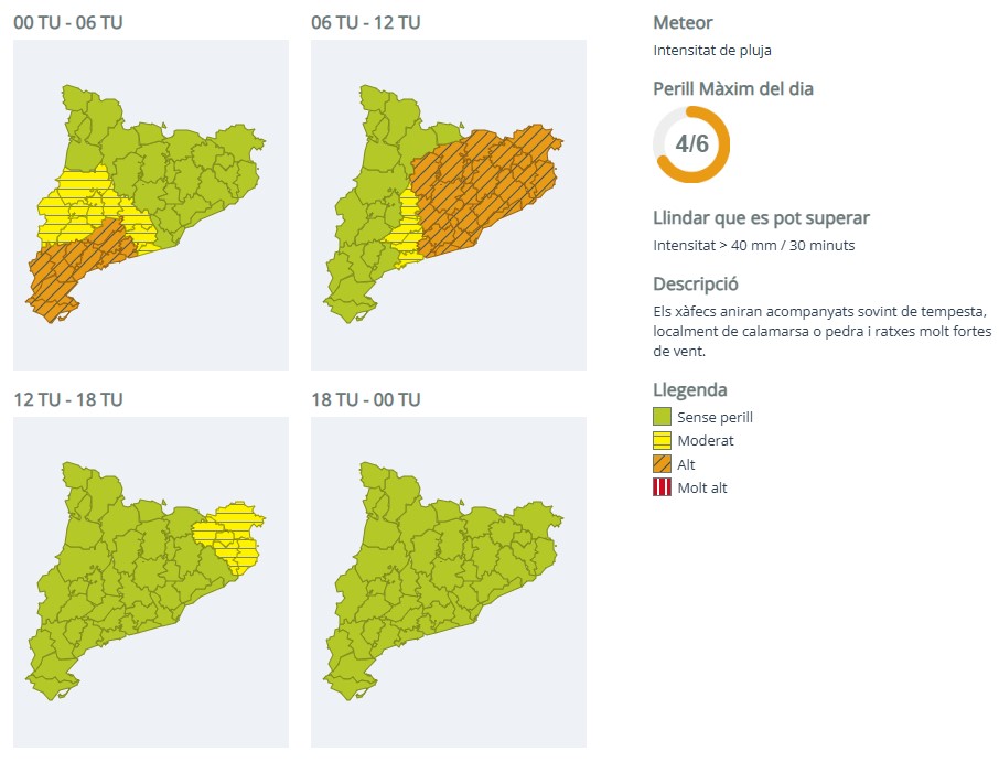 Les pluges poden superar els 40 mm en 30 minuts i anar acompanyades de tempesta i vent. En algun punt del territori s'ha avisat que es poden arribar a acumular entre 50 i 70 litres/m2.